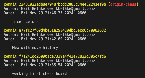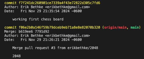 Notice from the time stamps last night that at 9:26pm I merged 2048 into main as it was in a good enough place for now, and then 9 minutes and 33 seconds later where I have my first commit on the chess branch with the comment that I have a working chess board: