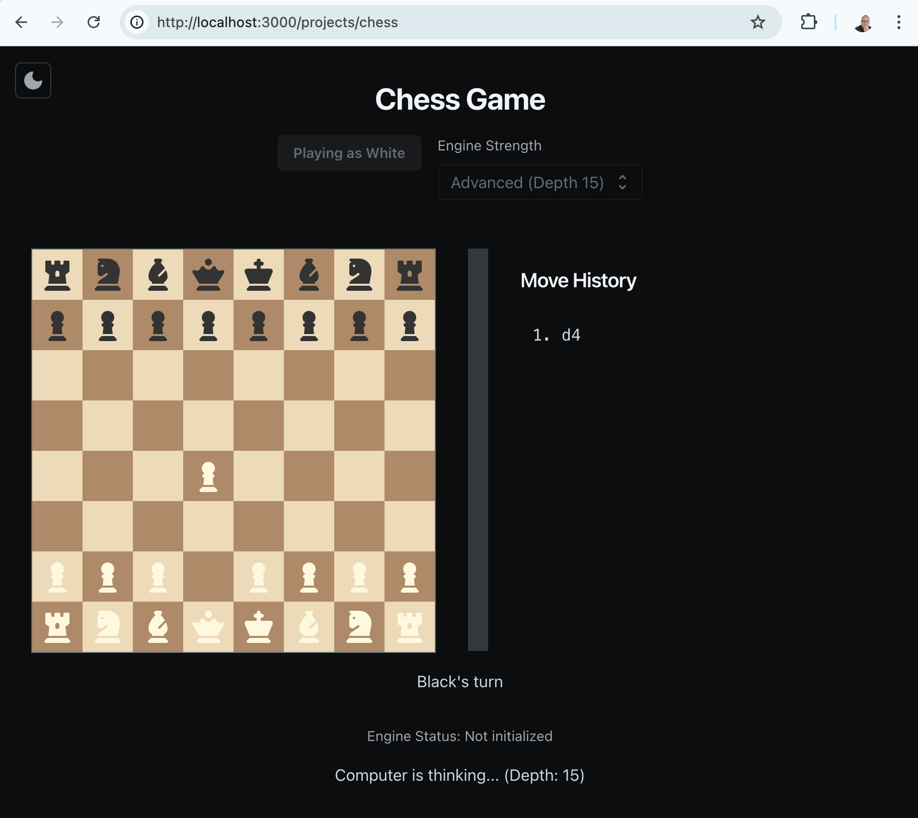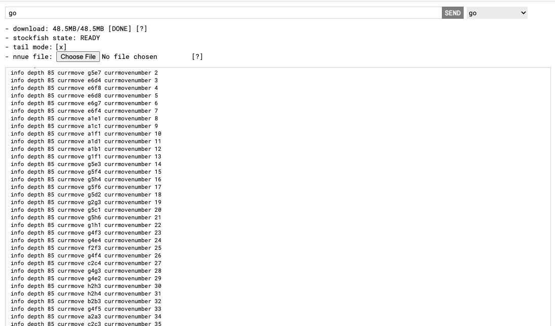 This was already amazing right here, I knew stockfish was available but I did not know about the chess.js library before and the last time I tried to pull together this project I got bogged down trying to reinvent those wheels.