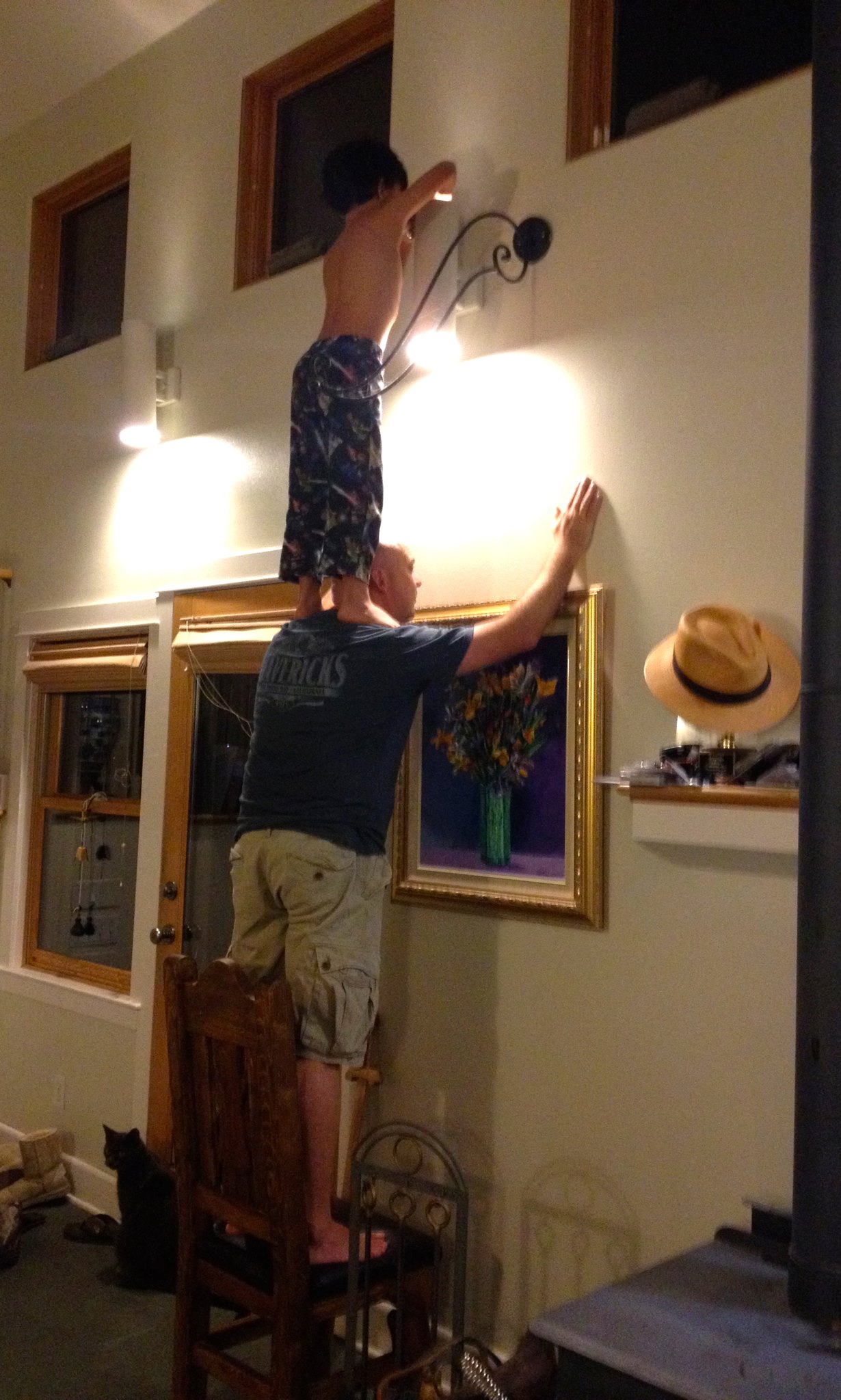 Check out the teamwork with Max and I, replacing some hard to reach lightbulbs with CFCs...