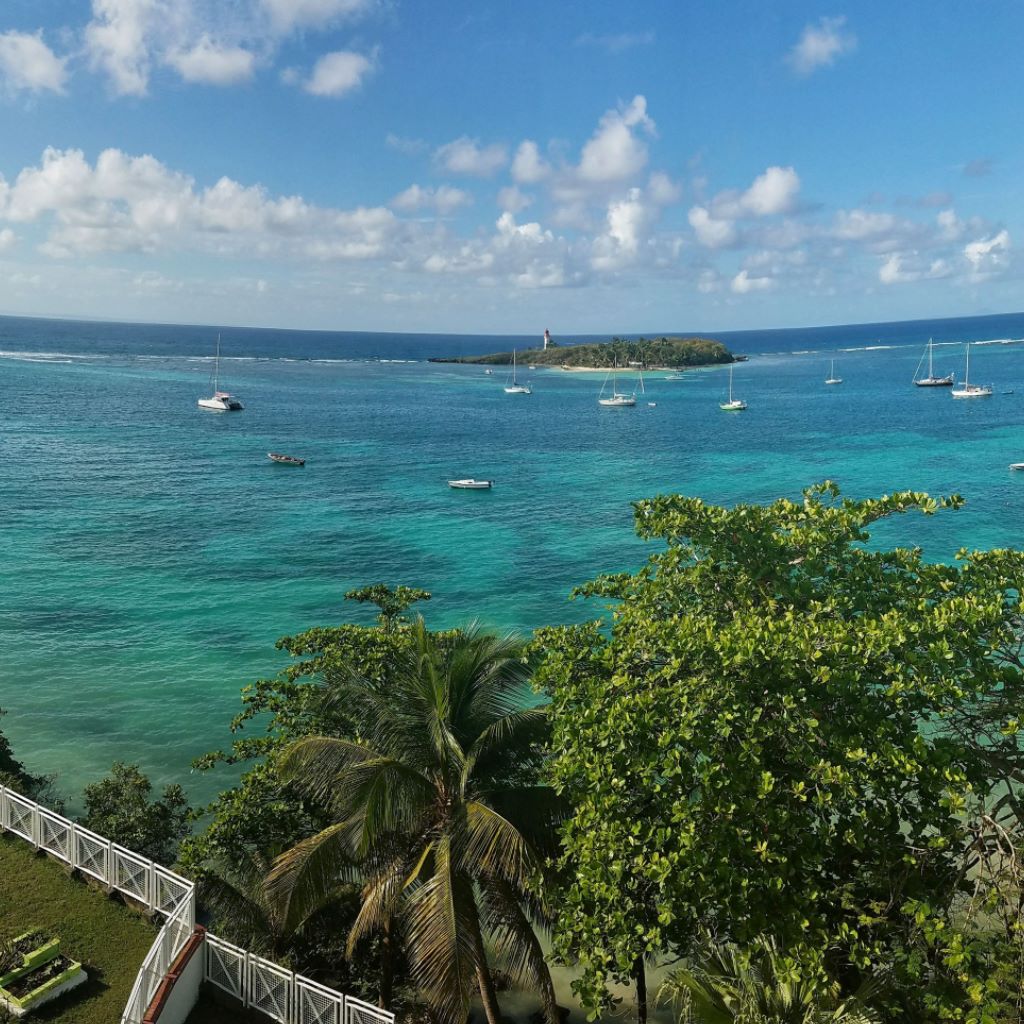 Another view of the red lighthouse on Ile du Grosier. Ad Astra is the catamaran with the red kayak strapped on top, far middle right.