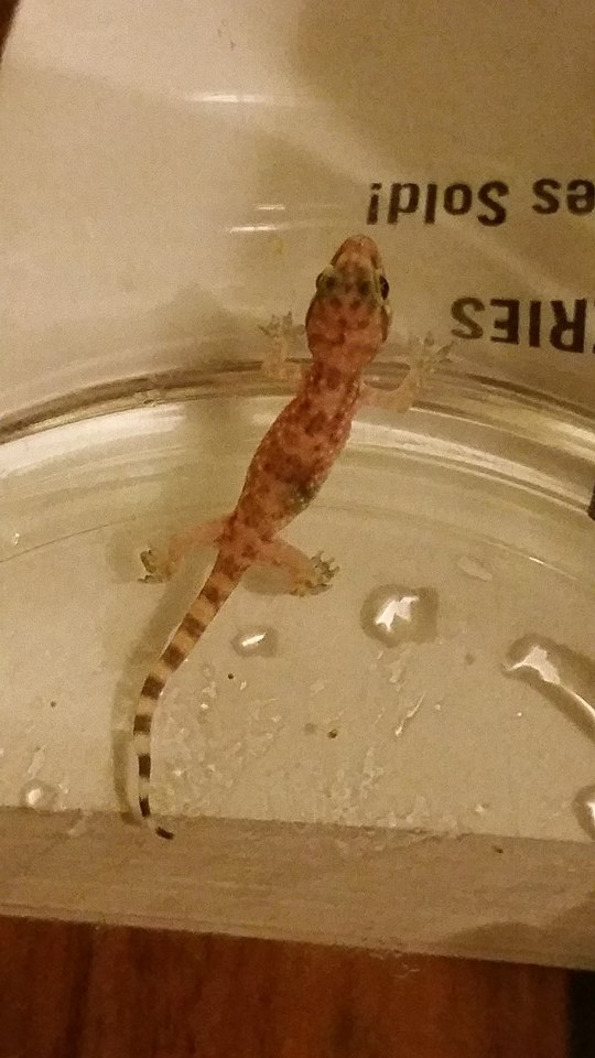 This is a baby gecko. I found him in my bathroom sink *after* I stuck my head in there sideways to grab a drink before going to sleep. A little surprise. Trying...