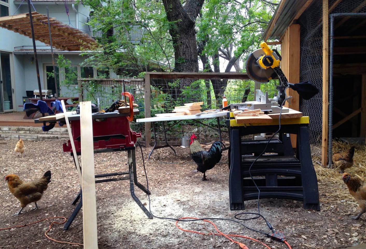 My fowl crew helping build the bee hive boxes Originally posted on Facebook on April 20, 2014.