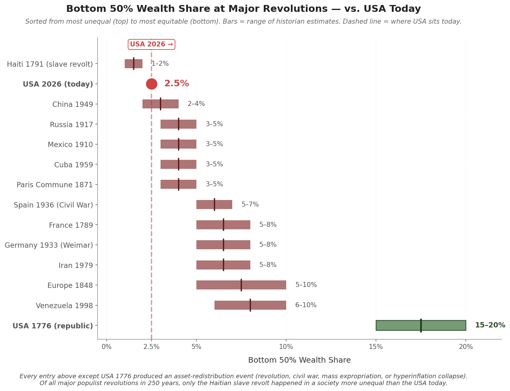 The strength of the argument does not depend on any single estimate. It depends on the ordinal ranking, which is robust across multiple independent reconstructions. Every revolution shown happened in a society with a bottom-50% wealth share materially below America's 1776 distribution. The United States in 2026 sits below all but one of those rankings. That comparative claim survives any plausible adjustment to the individual numbers.
