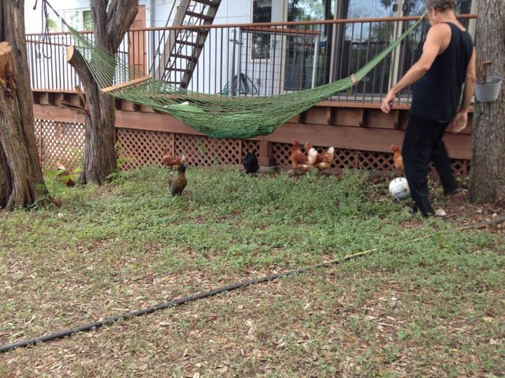 My dad playing soccer with the chickens...