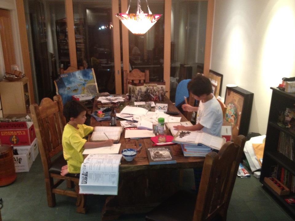 Here is our gaming room! Kyle is working on his characters, max in dungeon craft, beer, wine and mead in the corners and 35 years of RPG stuff on the shelves!