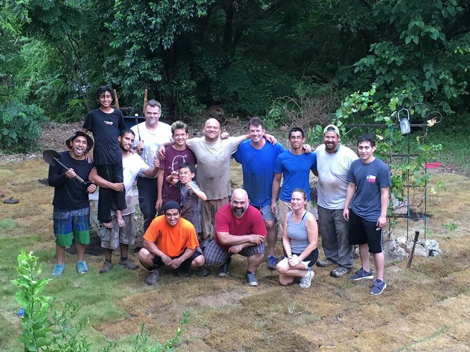 There was a huge SNAFU with the $6000 of grass. The resulting problem was 5000 square feet of grass cooking in the Texas sun on pallets. The lawn company was able to get their foreman Austin out to lead, but no labor was available. The grass was going to die. I of course had help from Javier, Marcus, Isaac Vazquez, and Eloy. But we were going to need more. At 2pm, our sensei John Roberson and Sarah Roberson called in a dojo air strike. Sensei, Sarah, their two boys, Herman, Ed and Michael all came with extra wheelbarrows and huge heart.