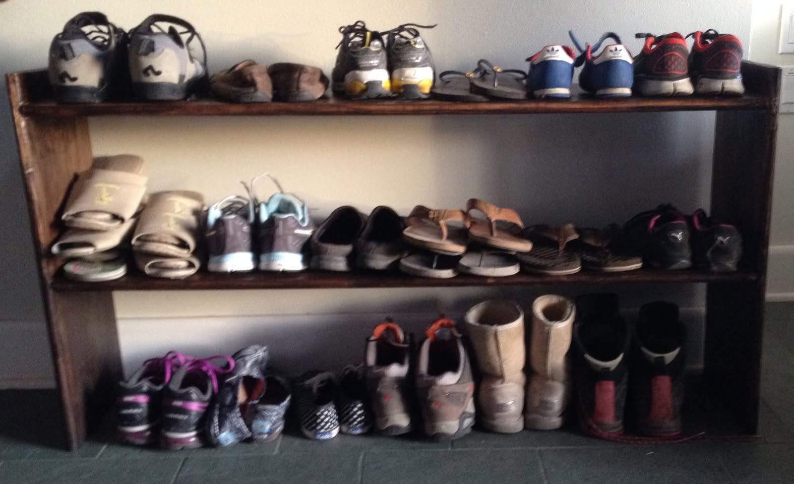 And now all of the shoes are nicely organized. Cost: 2 hours, $8 of pine board, 8 biscuits for the joins, and 1/4 of a small tin of stain. Oh, and some child labor.