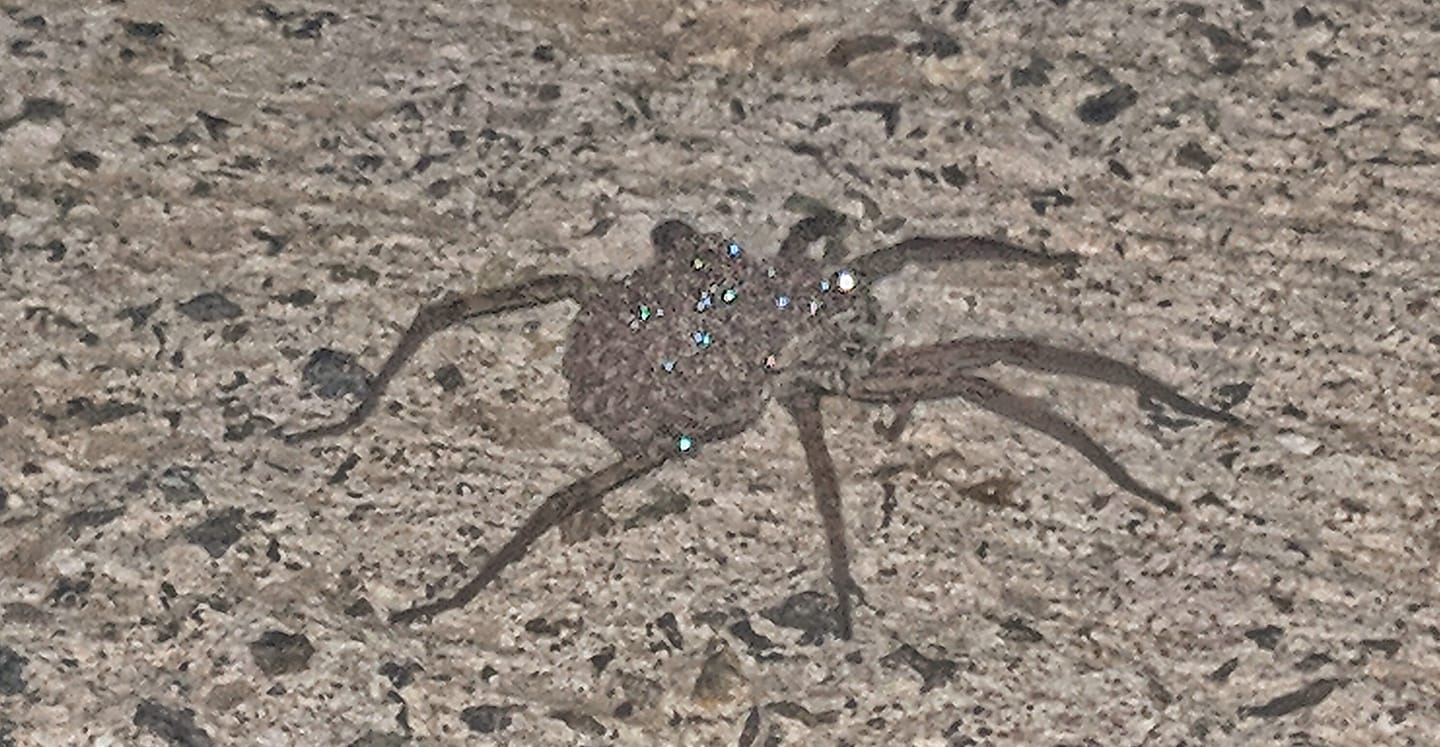 Just came across this very impressive wolf spider. The sparkling lights on her back are her babies' eyes responding to the flash. For size she seemed to be abou...