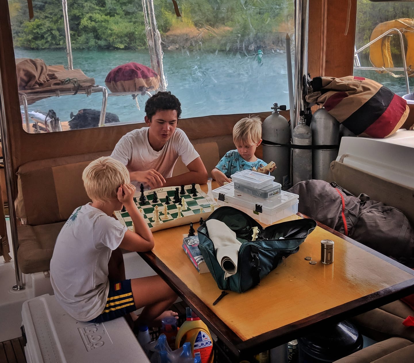 Kyle teaching chess this morning to a couple of fun Norwegian boys here in Shelter Bay, Panama.