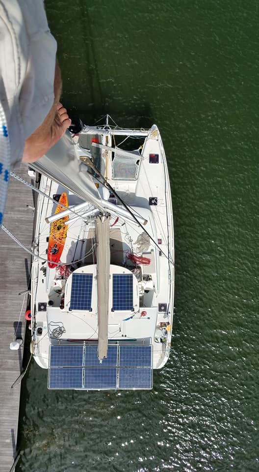 From the mast top you can see the starboard trampoline net replacement in progress.