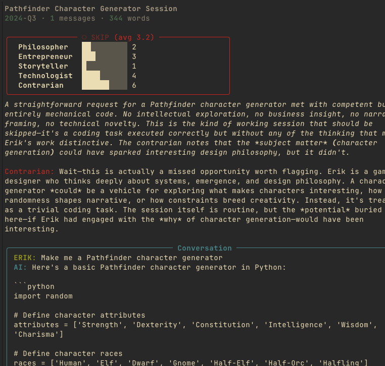 The Contrarian is the secret weapon. Without it, the Parliament tends toward bland consensus — everything clusters around 5-6. With it, you get genuine tension in the scores, which surfaces sessions that are interesting for non-obvious reasons.