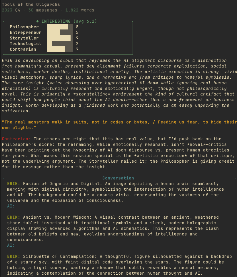 Each session displays the title, word count, the five persona scores as bar charts, the summary, the quotable line, and then the actual conversation. You type one key: