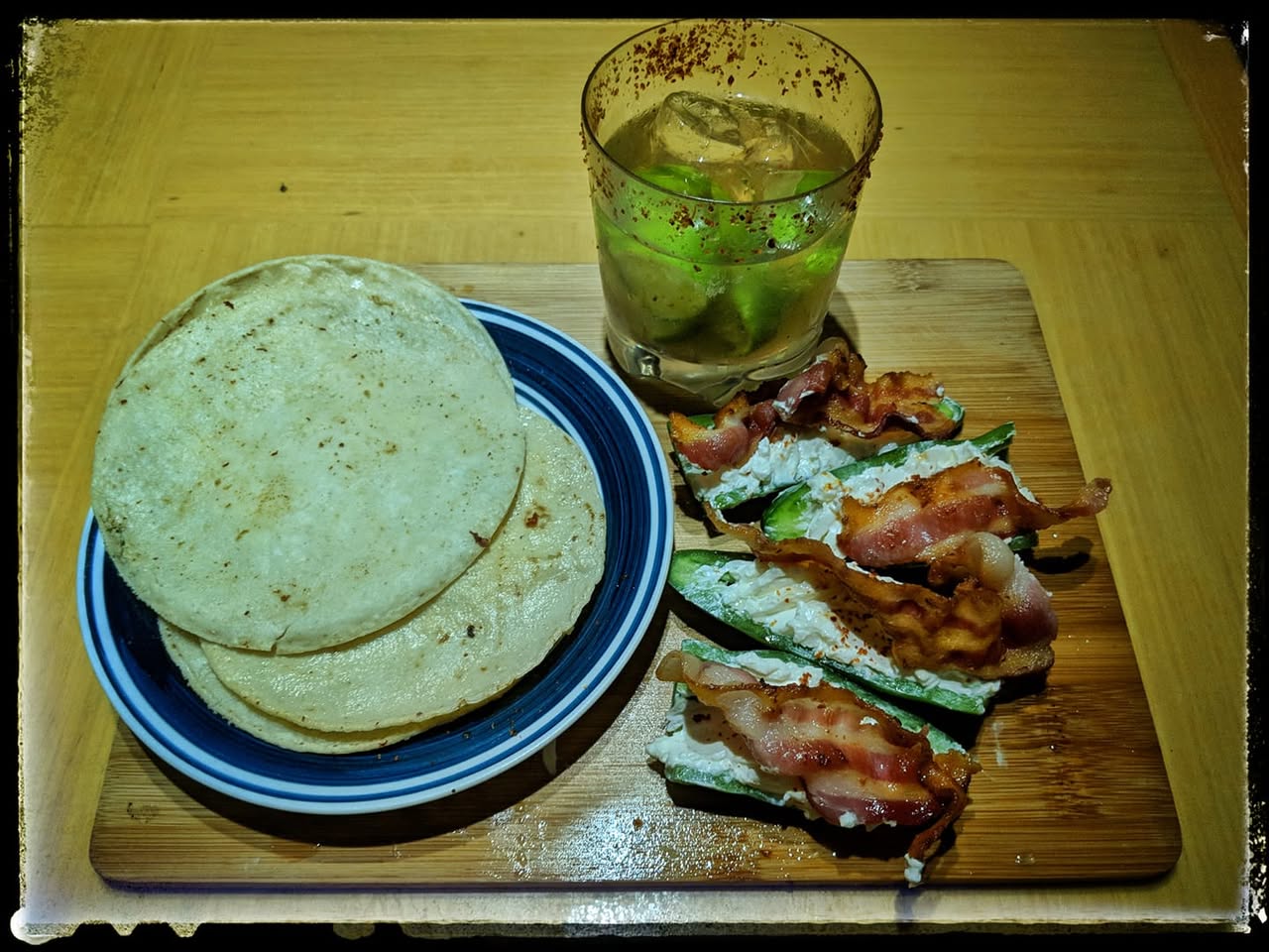 So! I made myself two quesadillas, with jalapeno, cream cheese and bacon poppers with an excellent margarita, well that's a lie, it was just straight up tequila on the rocks with lime and Tajin spiced salt.