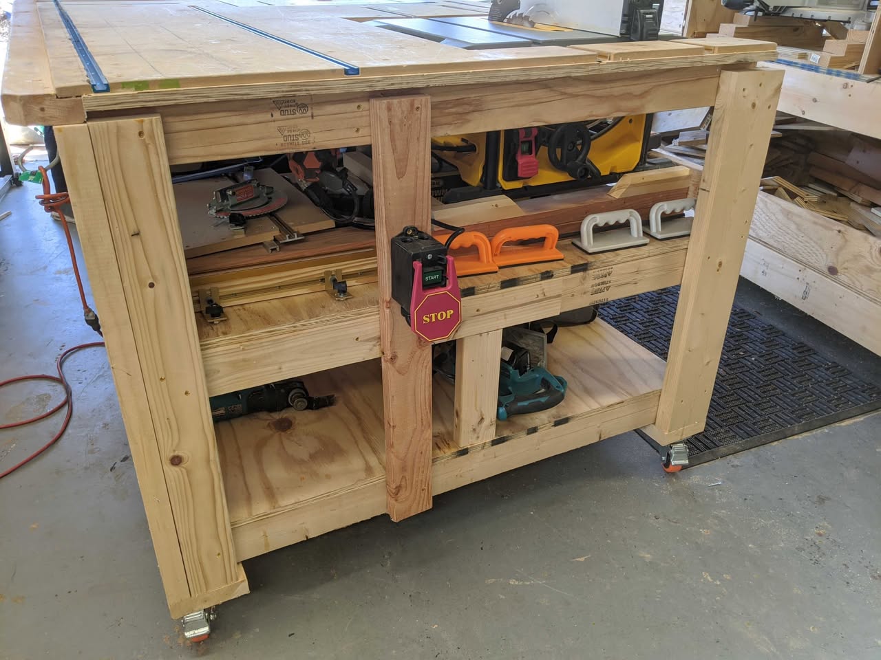 This weekend's projects: A new 10 foot x 2 foot workbench. Super safe power switch for the table saw (that also powers my ghetto dust collection). And a miter s...