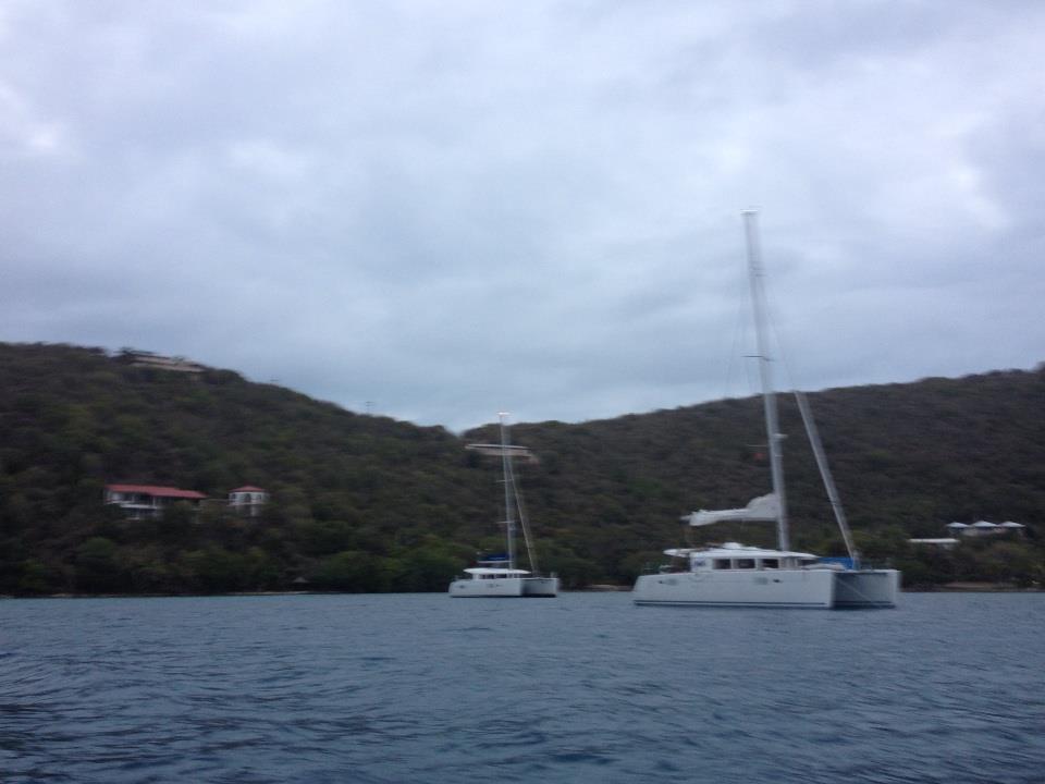 Moments before the sun came up, at anchor behind Marina Cay. Ad Astra leading two Lagoon 400s
