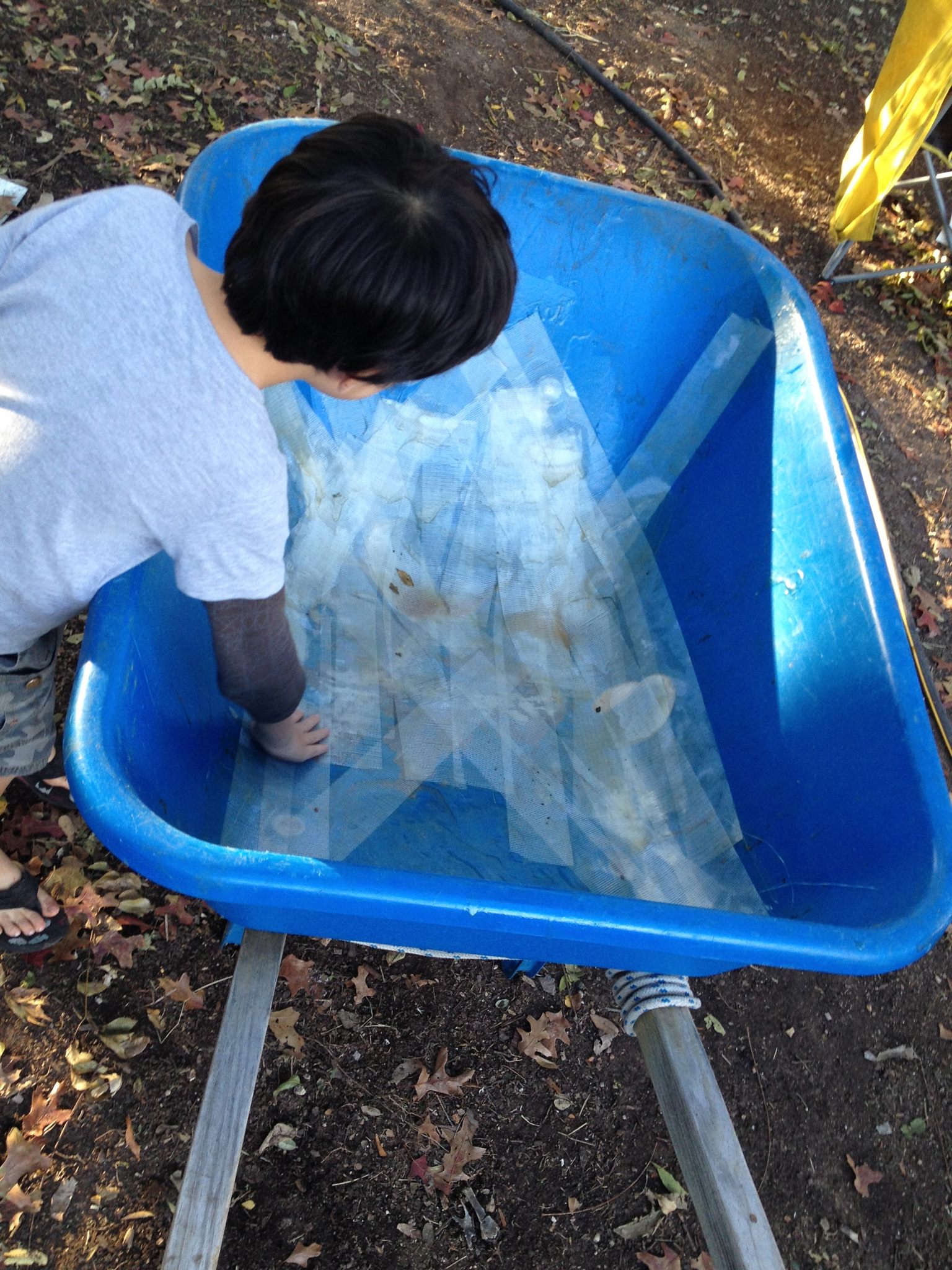 Fully repaired wheelbarrow. Stronger than the original with over 12 square feet of fiberglass reinforcement!