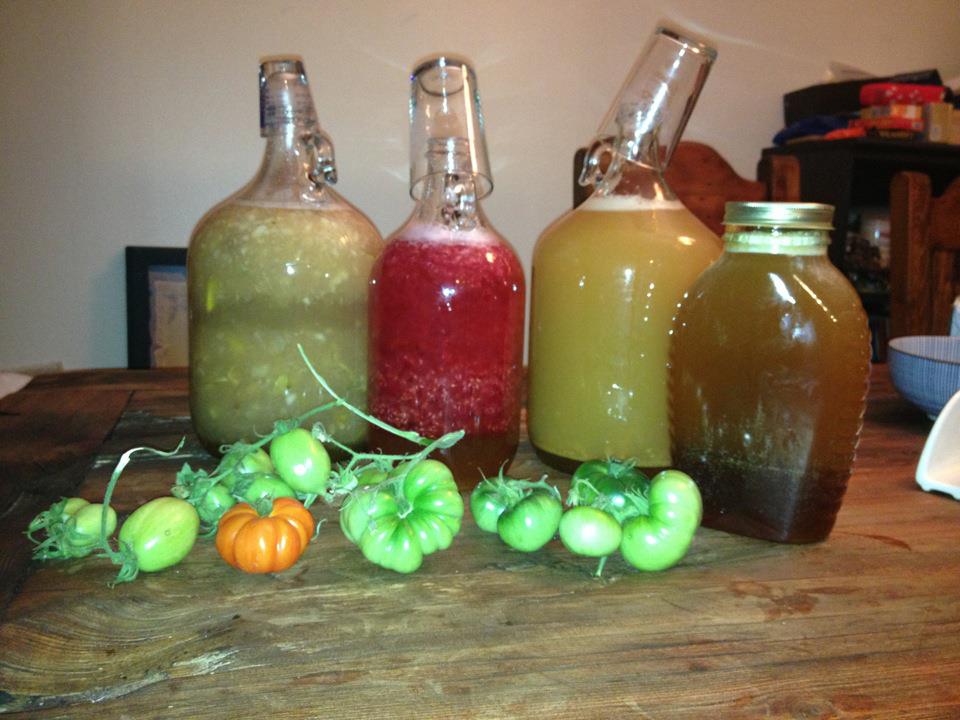 That was a fun day making mead! Mead! Left to right: pear, raspberry, apple and straight honey. All organic, local. The garden tomatoes are just hanging out hop...
