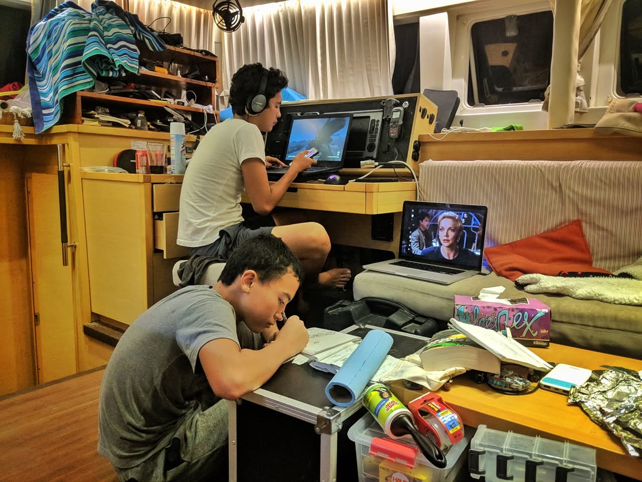 Kyle is playing Fallout, Max and I are watching Babylon 5, and Max is sketching.