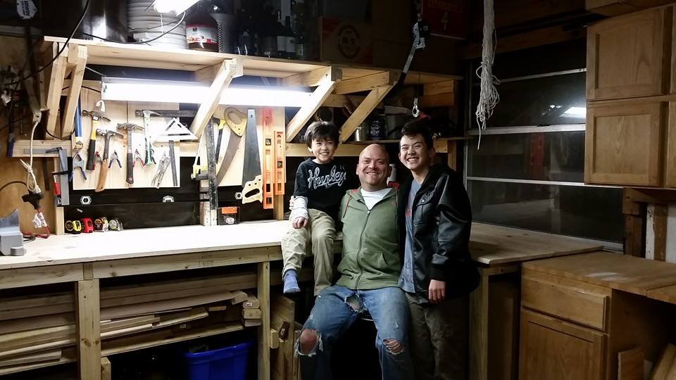 All new work bench (11 × 3 feet plus return), under bench storage, and simple struss shelves. 12 hours all in. Originally posted on Facebook on January 11, 2015...
