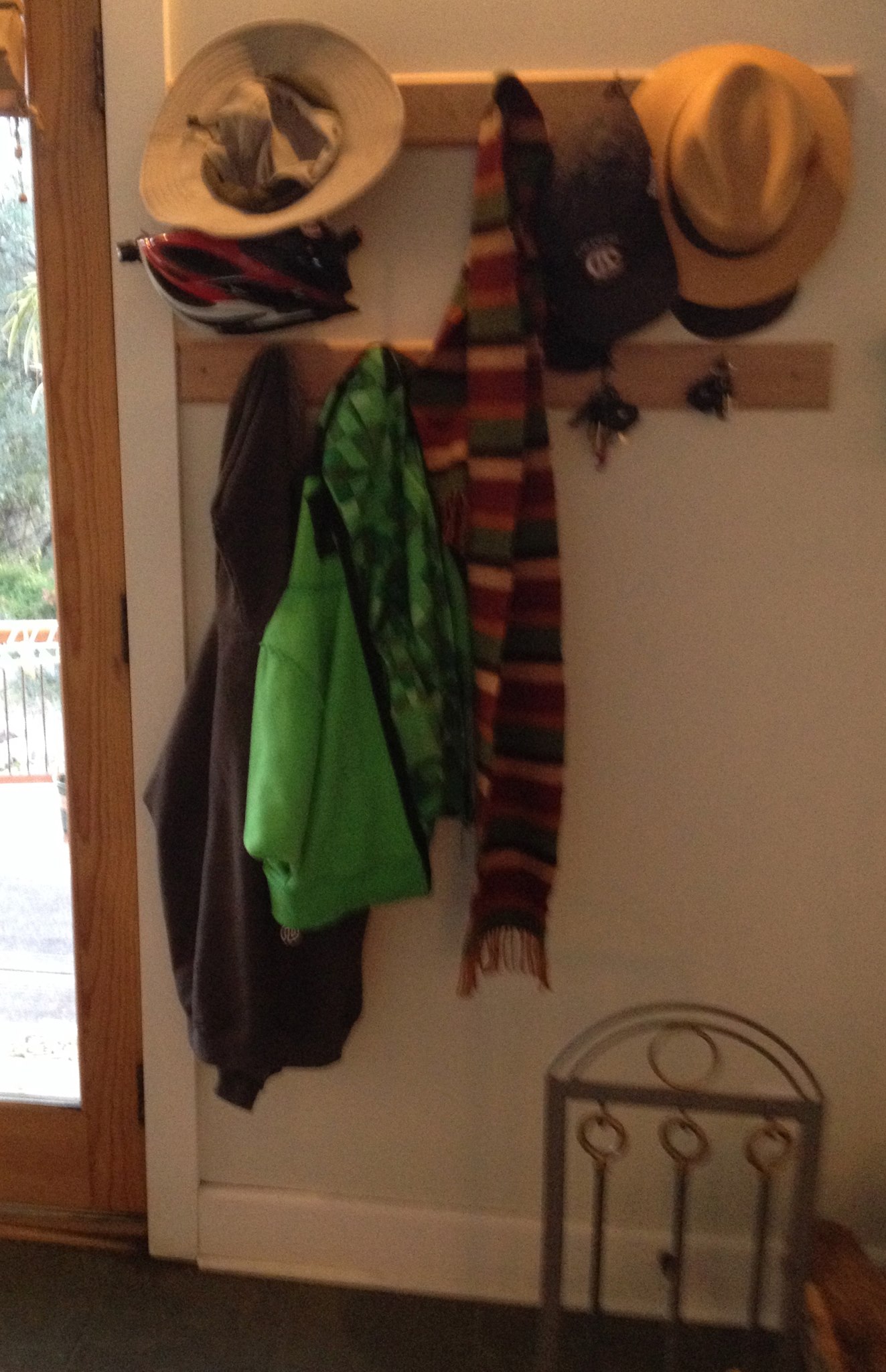 New hat, coat and key rack. Just $4 for the red oak board, a couple of swipes through the router and 10 ornamental hooks @ $1.25 each = $16.50