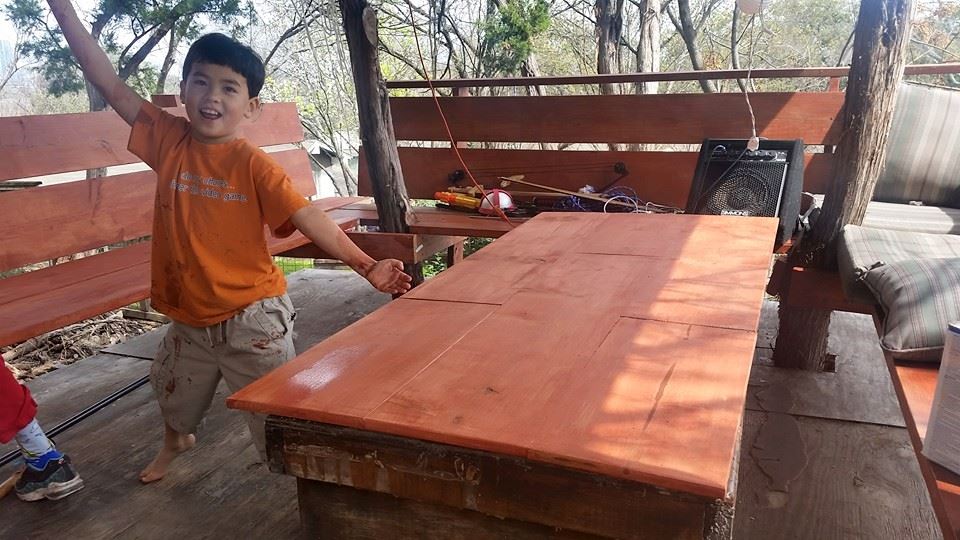 If you guys remember the game table top from last year, I didn't mix the epoxy correctly. I kept trying to just apply new layers over disasters and it frankly was a bad eye sore. So I made a new table top yesterday and the boys stained it this morning.