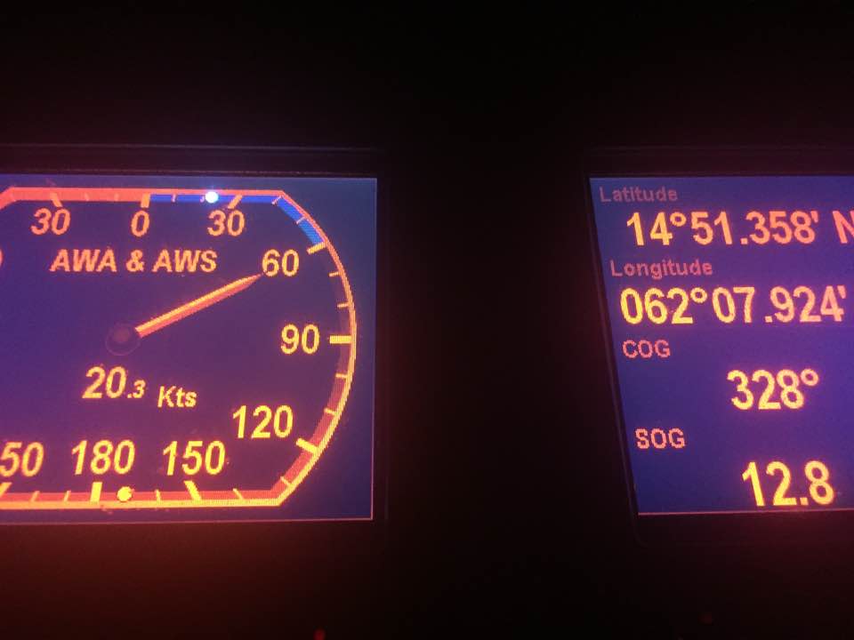 Here is a shot from one of my night watches where the Lagoon 500 gets up to 12.8 kts in 20 air.