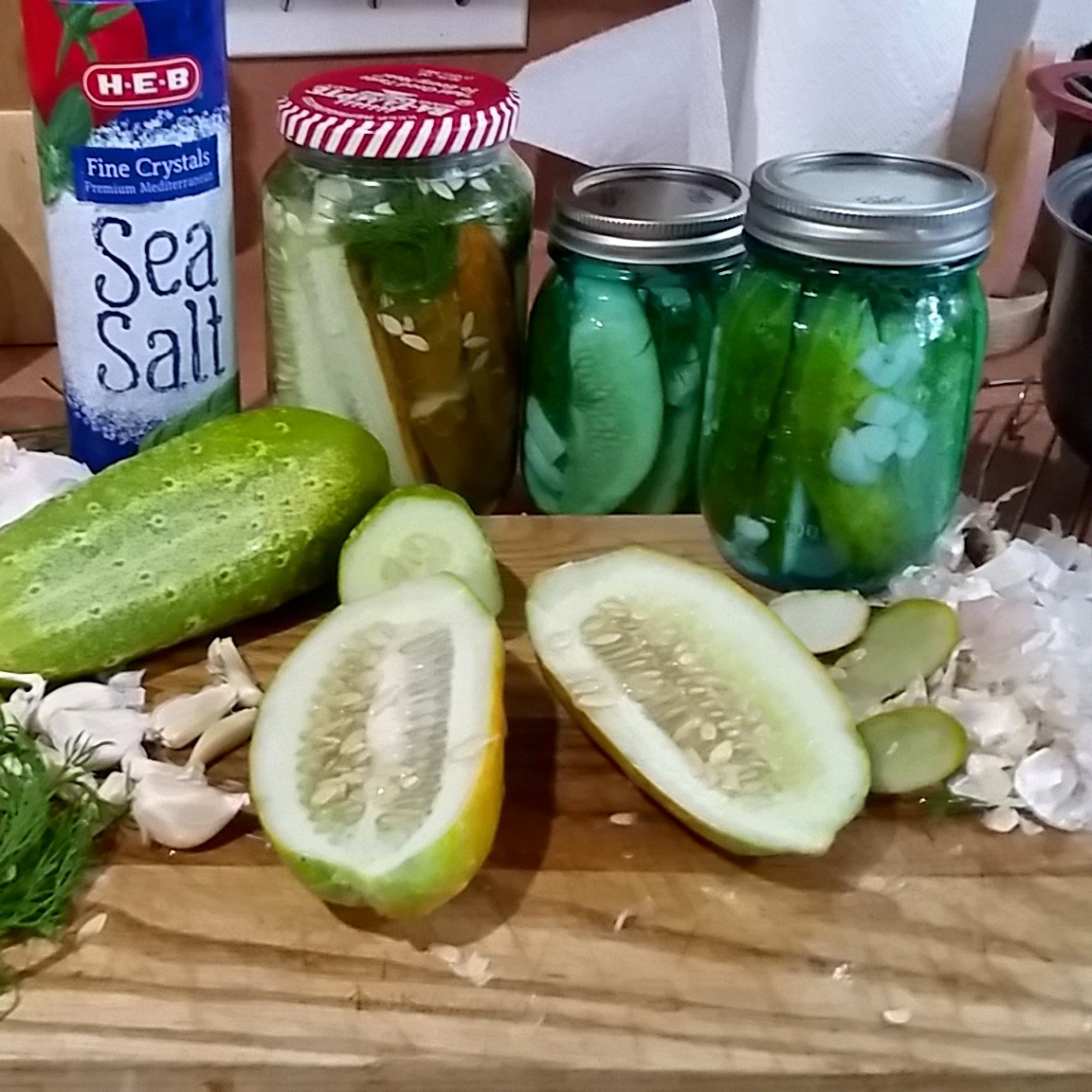 Making pickles with the first pick of summer. Garlic, dill, vinegar, sea salt and water. Recipe book suggesting young grape leaves - I have those! Raining outsi...