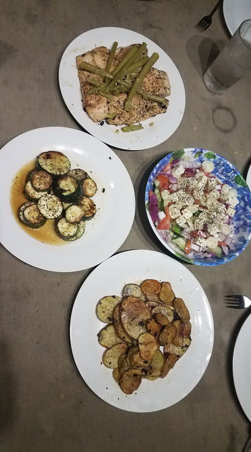Salmon, potatoes, zuchinni and a med salad.