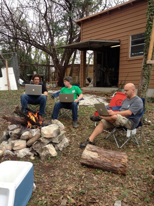 Bee Cave Games - coding around the camp fire on a Sunday afternoon... Kyle and Max are playing Minecraft with Amanda