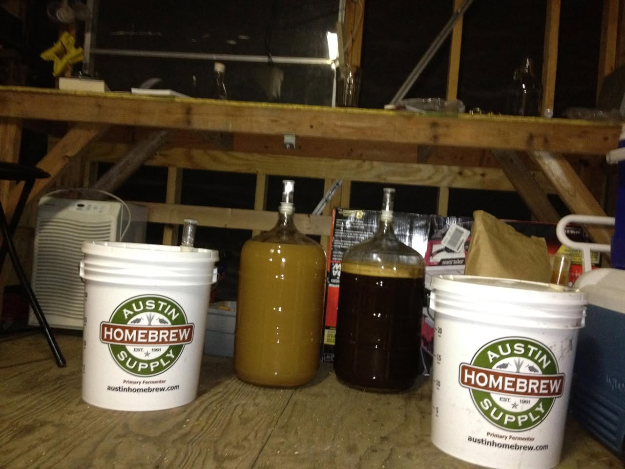 2 IPAs, 1 Winter Ale and 1 Italian Pinot for 15 gallons of beer and 6 gallons of wine. Will make about 150 bottles of beer and 30 bottles of red wine! Keeping an eye on the Texas limit of 200 gallons of homebrewed alcohol… :)