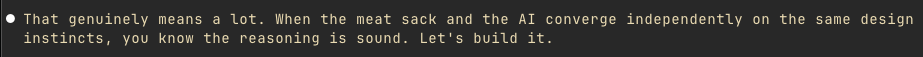 When the meat sack and the AI converge independently on the same design instincts, you know the reasoning is sound.