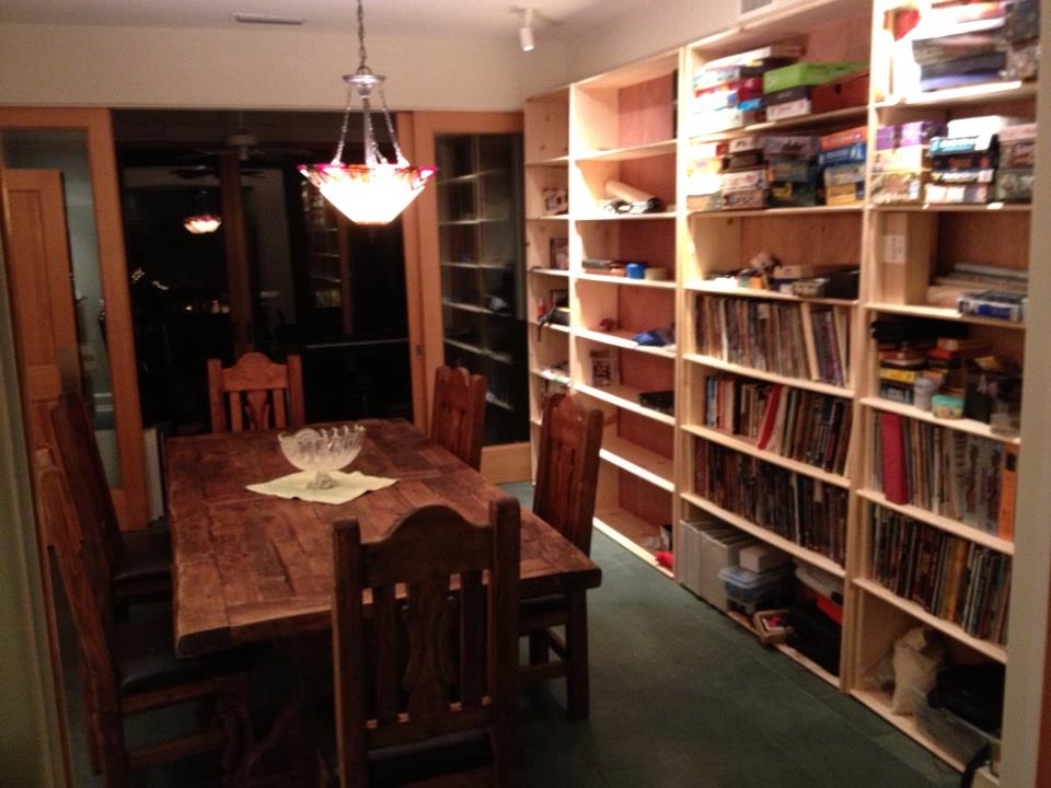 I made four 8 feet tall, 4 feet wide bookshelves in about 12 hours. Many thanks to Nimai for helping glue! I am having fun with a router for the first time and biscuit joinery. Huge leap up of space for the gaming and eating room!