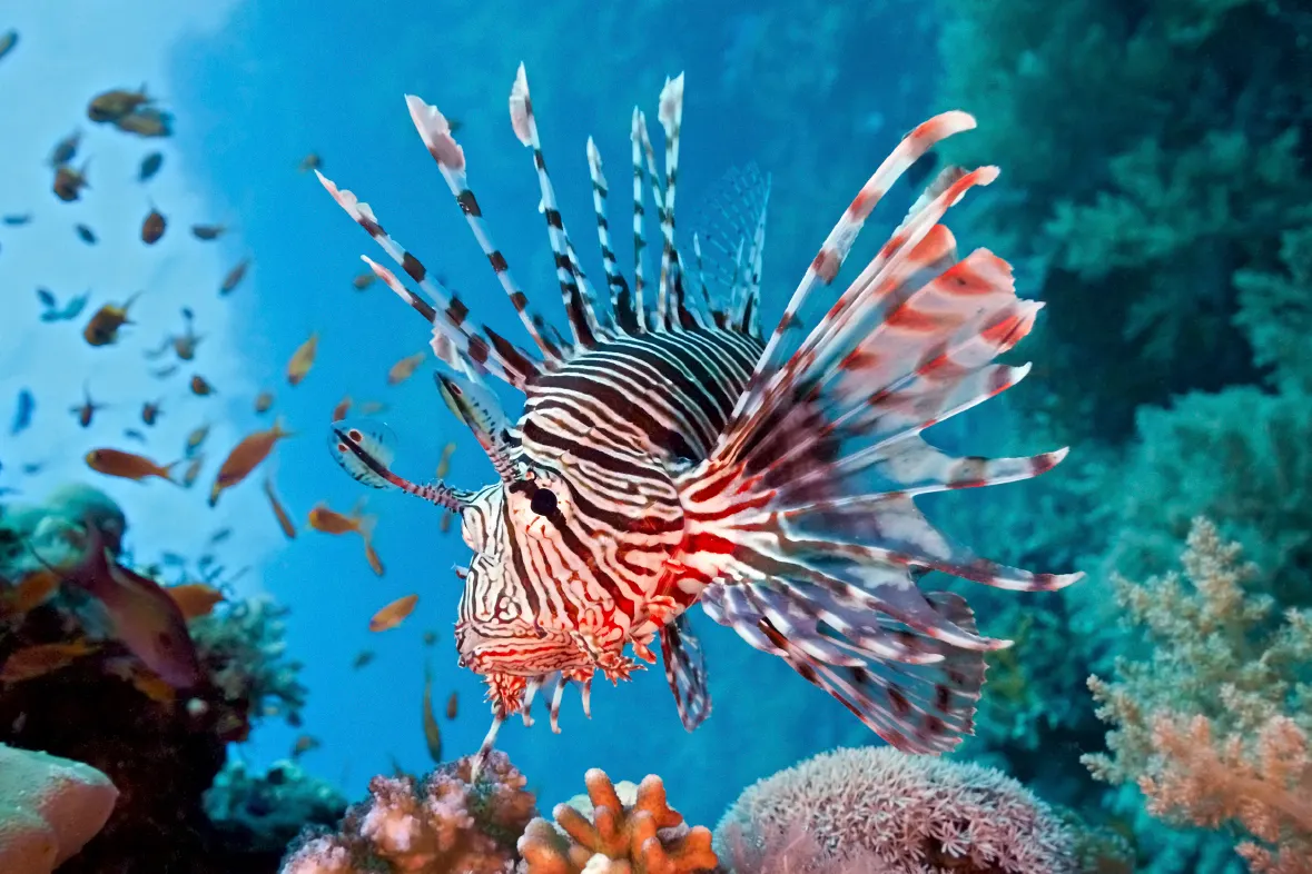 We descended to 35 feet quickly, and started cruising up the coast between 35–55 feet. During the day the Lionfish hang out under the ledges of larger coral encrusted boulders on the seaward side. They are pretty easily to spot with their wild colors and that they are almost still.