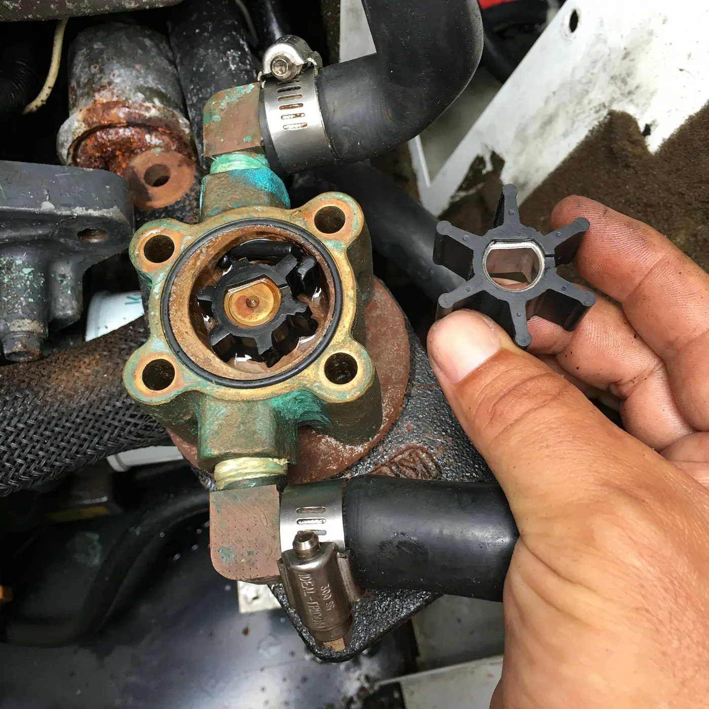 Suequei has these great angled tweezers, and in just about 10 minutes we cleared all of the bits and re-assembled the old impeller like a jigsaw puzzle to see of we got them all. Yep. Popped in the new impeller, and new O-ring. Re-assembled the water pump, put back on the drive belt, test the generator. And happy on the first run! From start to fish — 70 minutes.